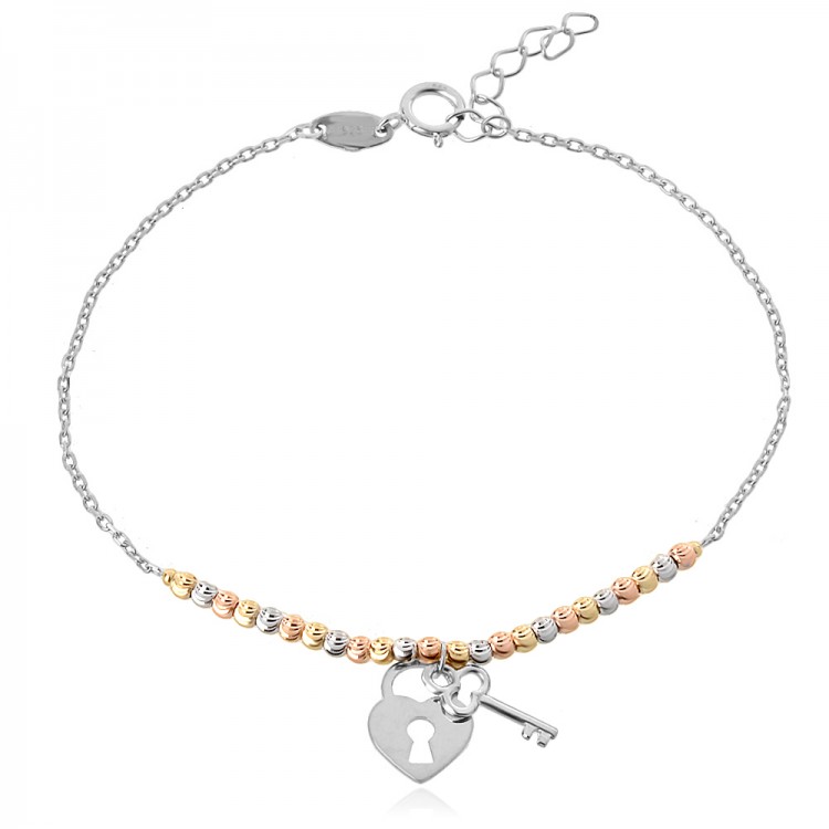 Irida е впечатляваща гривна, която съчетава класическите символи на сърцето и ключа с модерен трицветен акцент. Моделът е богато декориран с елементи с диамантиран ефект, които улавят и пречупват светлината от всеки ъгъл.