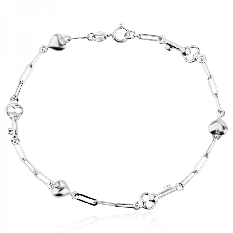 Сребърна гривна с дизайн, съчетаващ нежна верижка с деликатни елементи на сърца и ключета. Бижу с огледален блясък, създадено да носи послание.