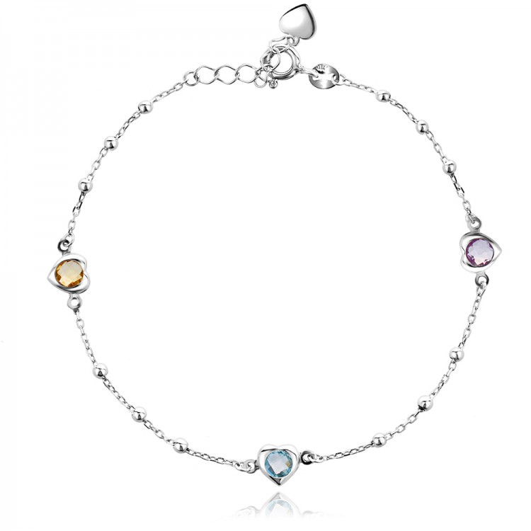 Гривна Trillia е символ на нежност и деликатен стил. Дизайнът се отличава с класическа ефирна верижка, акцентирана от малки сребърни сфери и три симетрично разположени сърца. Всеки елемент е инкрустиран със сияен цирконий в пастелни нюанси – лилаво, светлосиньо и кехлибарено, които внасят дискретен цветен акцент.